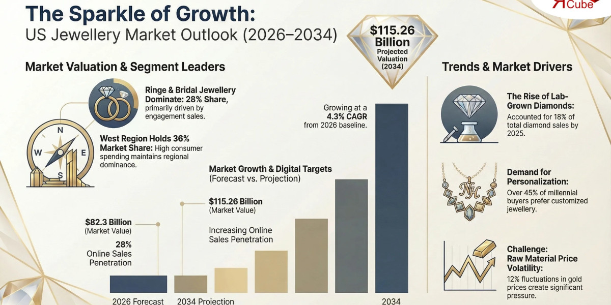 The Report Cube, a leading provider of market intelligence and strategic research solutions, has officially released its latest study titled "US Jewellery Market - Opportunity Analysis and Industry Forecast (2026-2034)." The report projects the size of US Jewellery market to be valued at USD 115.26 Billion by the end of the forecast period, expanding at a compound annual growth rate (CAGR) of 4.3%.